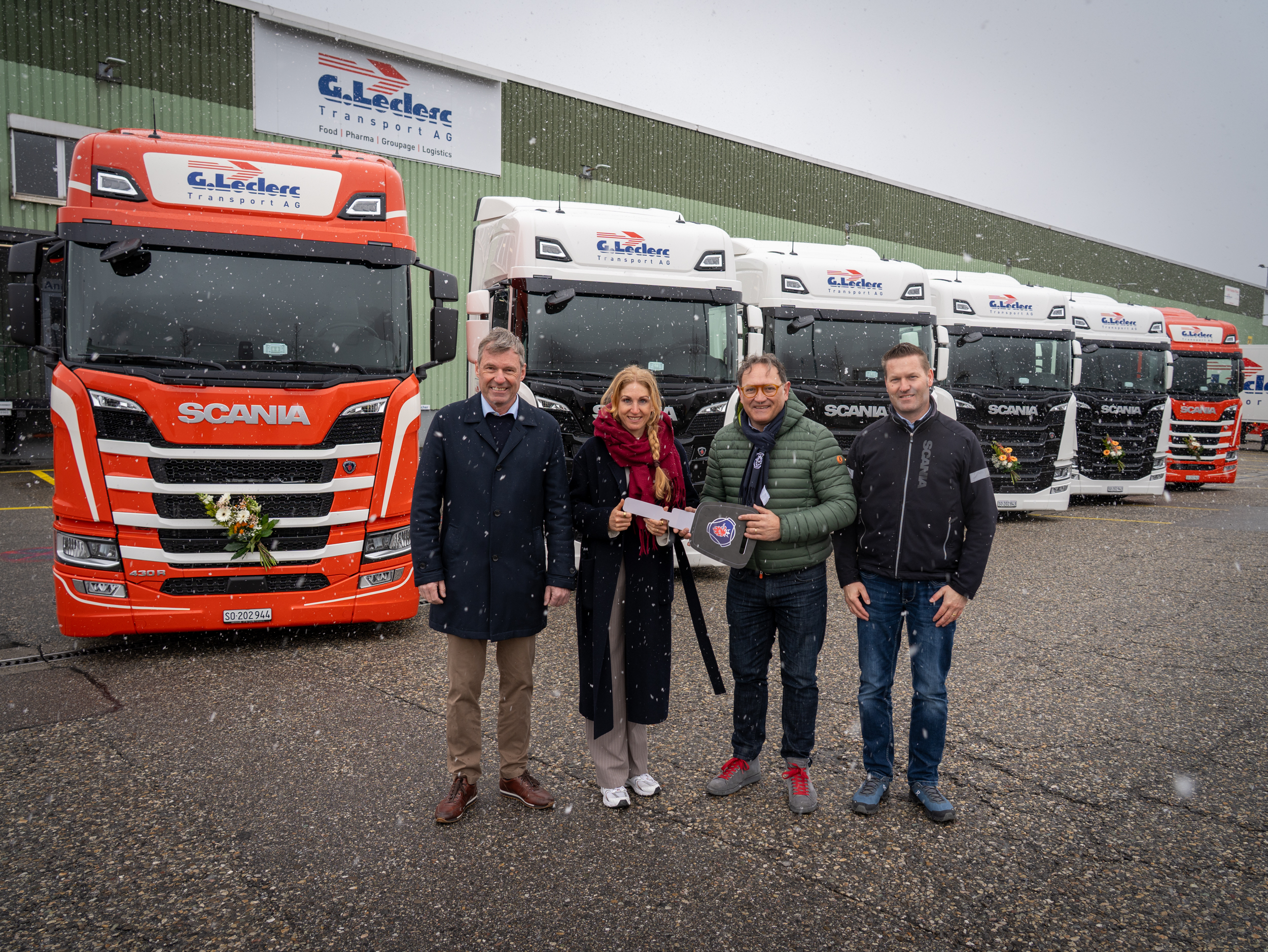 Mit der Übergabe von sechs identischen Scania Sattelzugmaschinen des Typs 430 R A4x2 baut die G. Leclerc Transport AG ihren Fuhrpark weiter gezielt aus. Die Fahrzeuge wurden im Rahmen einer offiziellen Übergabe durch Vertreter von Scania Schweiz AG an das Familienunternehmen aus Egerkingen übergeben.