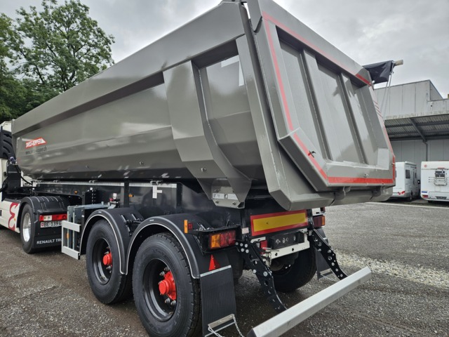 BPW Achsen mit Trommelbremsen, Bedienbox für Luftfederung, Bedienstand mit Rollplane, Mulde 24m3, Boden HARDOX HB 450 in 7mm, Seitenwände HARDOX HB 450 in 5mm, Leergewicht 6.000kg